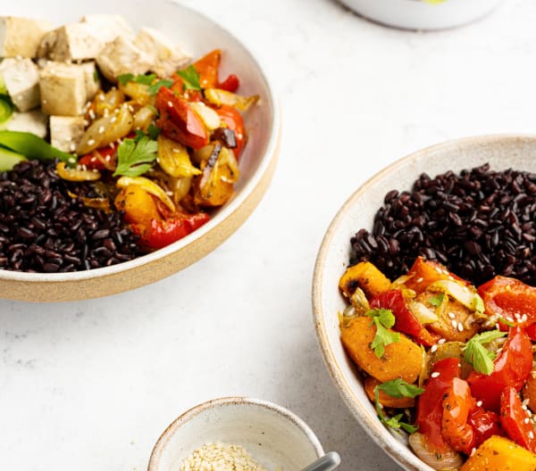 2. Añada el arroz negro. Coloque el cestillo sobre la tapa en lugar del cubilete y programe el tiempo que indique el paquete/100°C/giro inverso/vel cuchara. Mientras tanto, marine el tofu en un bol con 1 cucharada de salsa de soja y déjelo reposar. Cuando las verduras se hayan asado, póngalas en un bol para servir con todo su jugo. Cuele el arroz a través del cestillo y vierta en una ensaladera. Añada a la ensaladera las verduras asadas y el tofu marinado. Mezcle ligeramente con la espátula y sirva caliente rociado con ½ cucharada de salsa de soya.